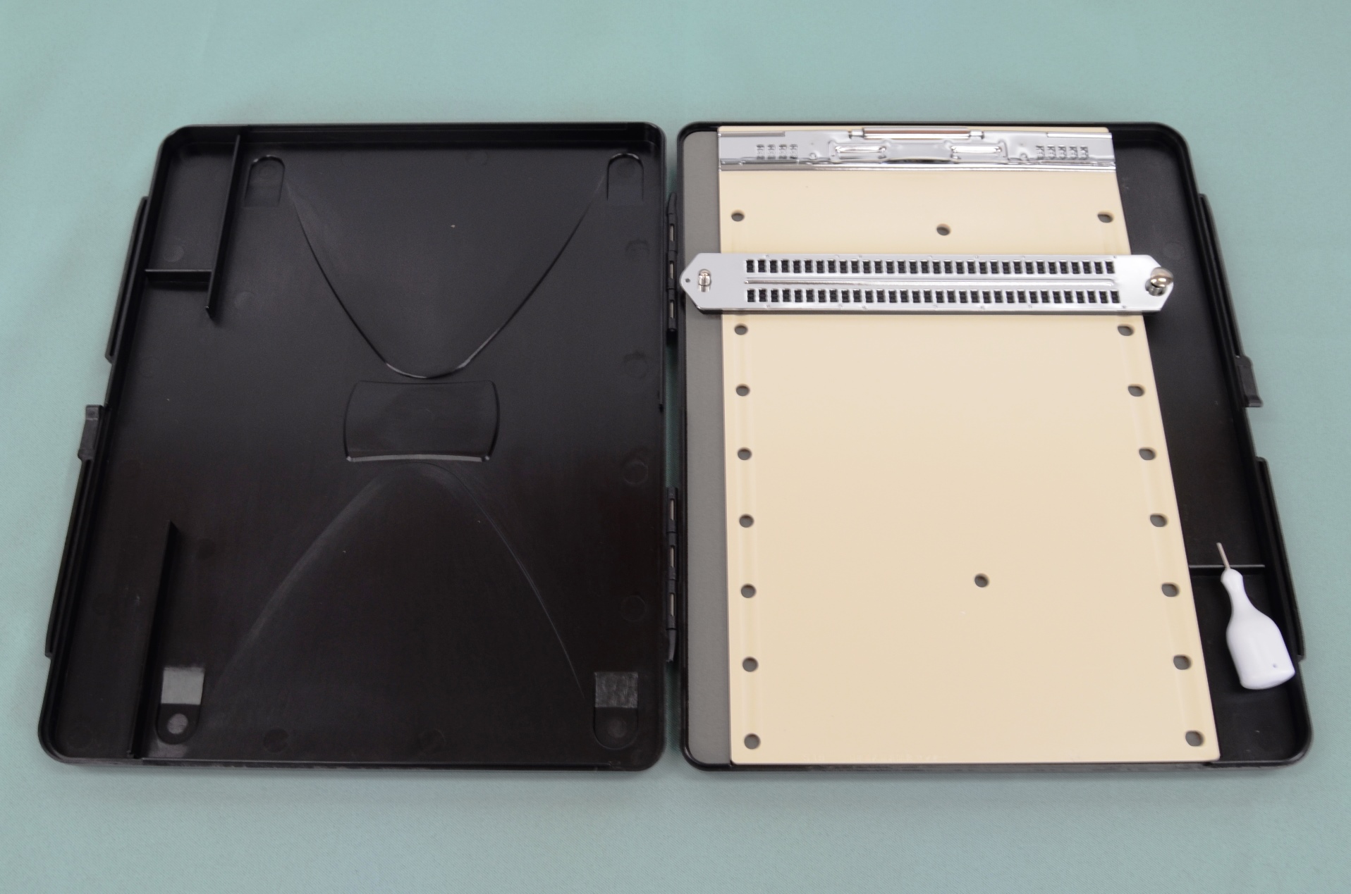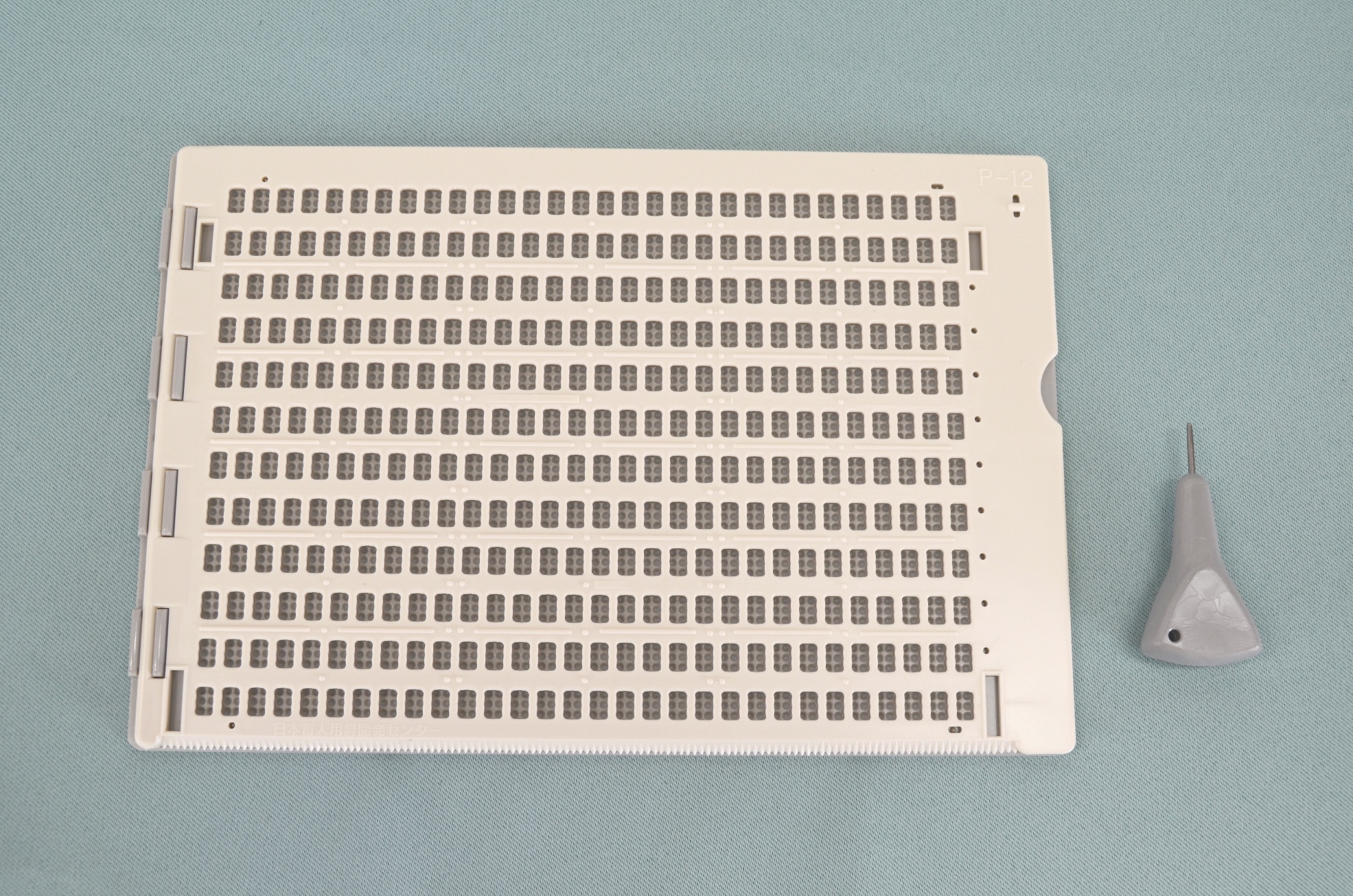 オリジナル商品。プラスチック製。片面書き、4行26マス。サイズは、縦6.5×横19.5×厚さ0.6cm。重さは51g。付属品はプラスチックケース。日本の標準規格より大きい点字で中途視覚障害者の方の点字導入時に最適。12mm・24mmテープ用のガイド穴があります。