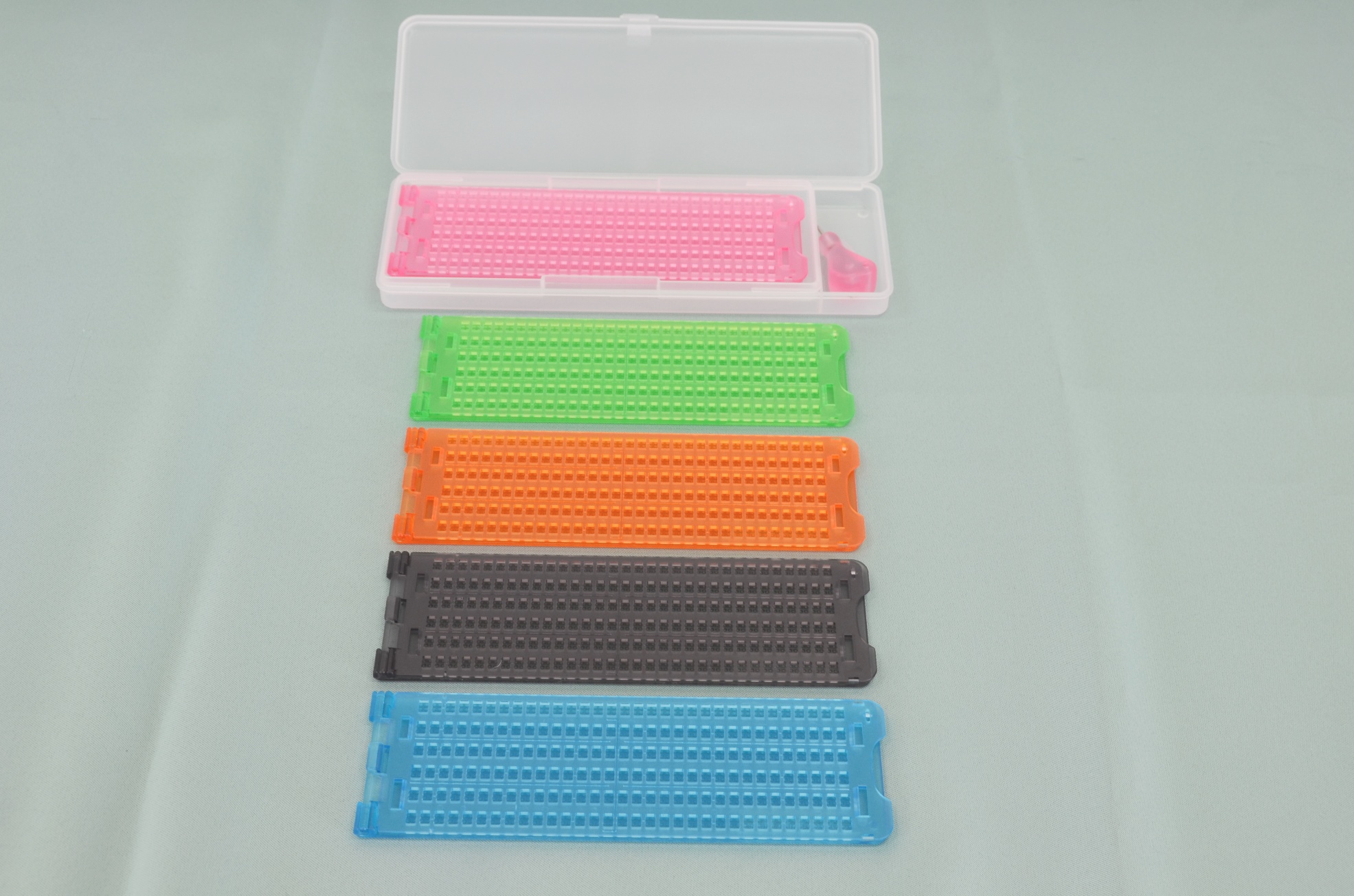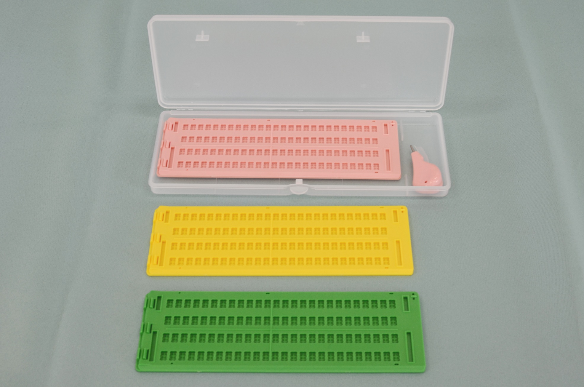 日本点字図書館製。プラスチック製。片面書き、6行32マス。サイズは、縦6.5×横19.5×厚さ0.5cm。重さは56g。付属品はプラスチックケース。色はクリアな緑・青・オレンジ・ピンク・グレーの5色。9mm・12mmテープ用のガイド穴があります。