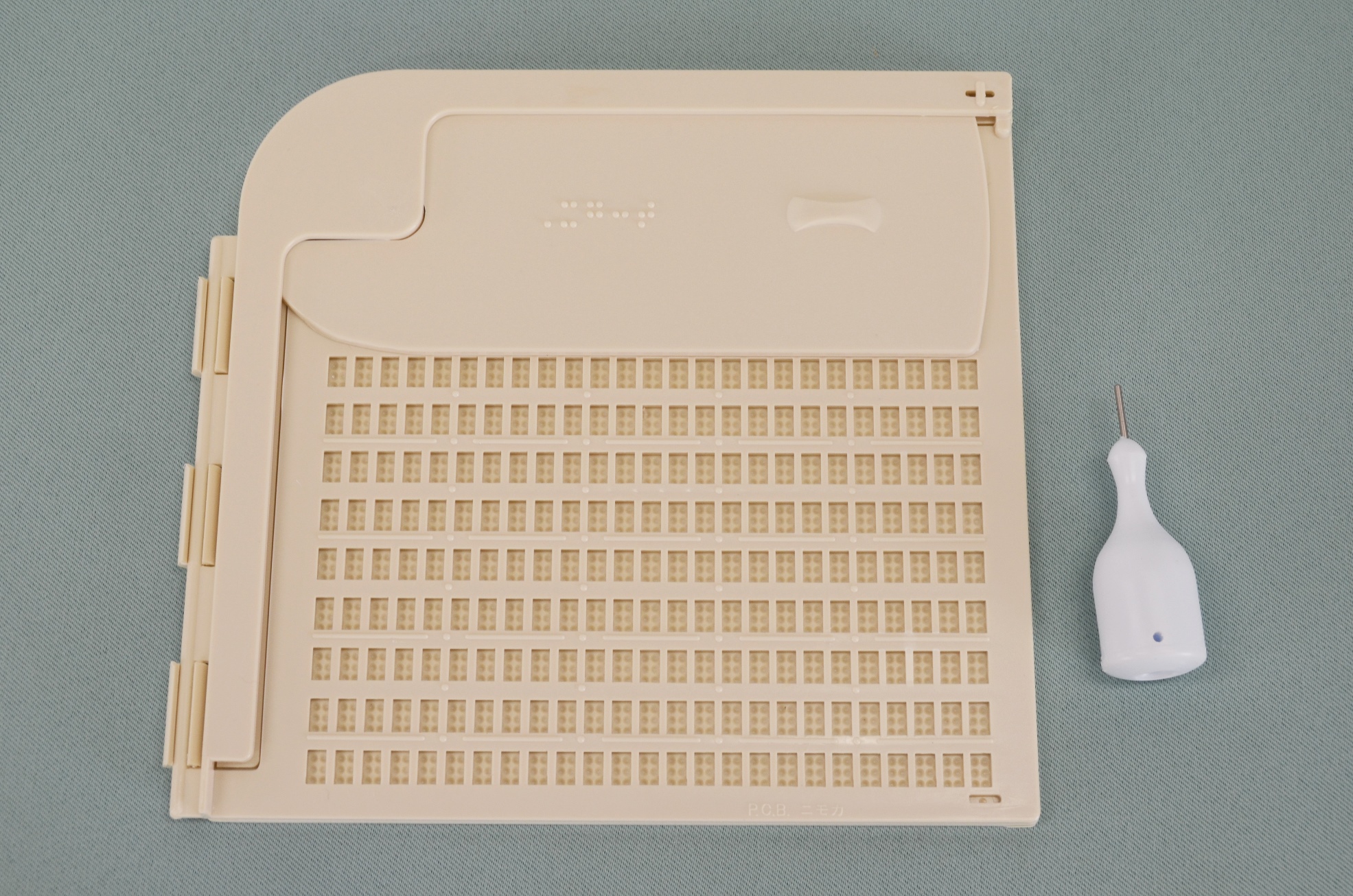 ニモカ製。プラスチック製。片面書き、12行30マス。サイズは、縦13.5×横20×厚さ0.5cm。重さは104g。付属品はビニールケース。色は上板がアイボリー、下板はグレー。9mm・12mmテープ用のガイド穴があります。