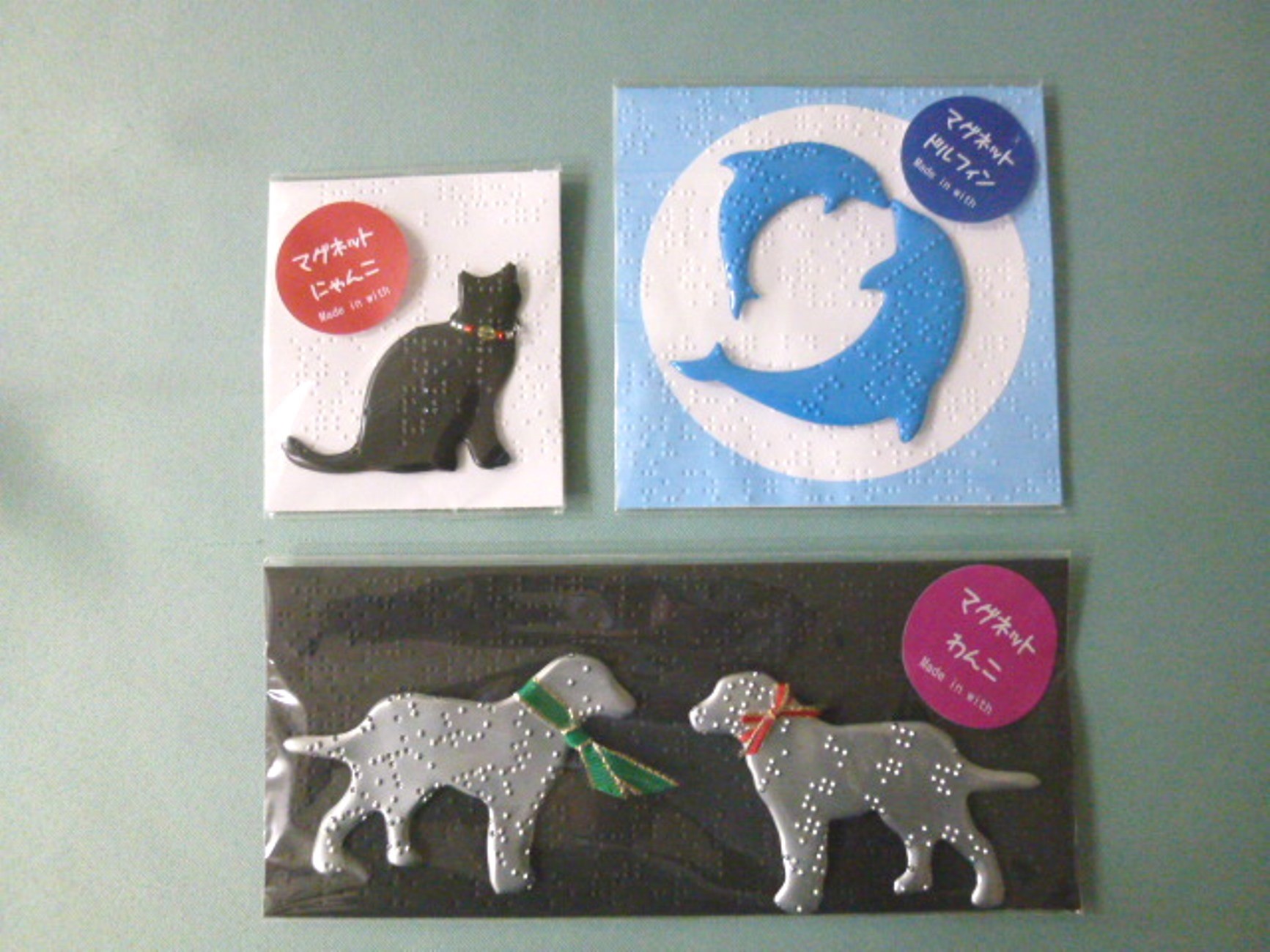 点字印刷用に使った亜鉛板を「盲導犬」、「猫」、「イルカ」の形に切り抜き、マグネットをつけました。「わんこ」は首にリボン、「にゃんこ」はビーズのネックレス付き。ちょっとしたプレゼントに最適です。