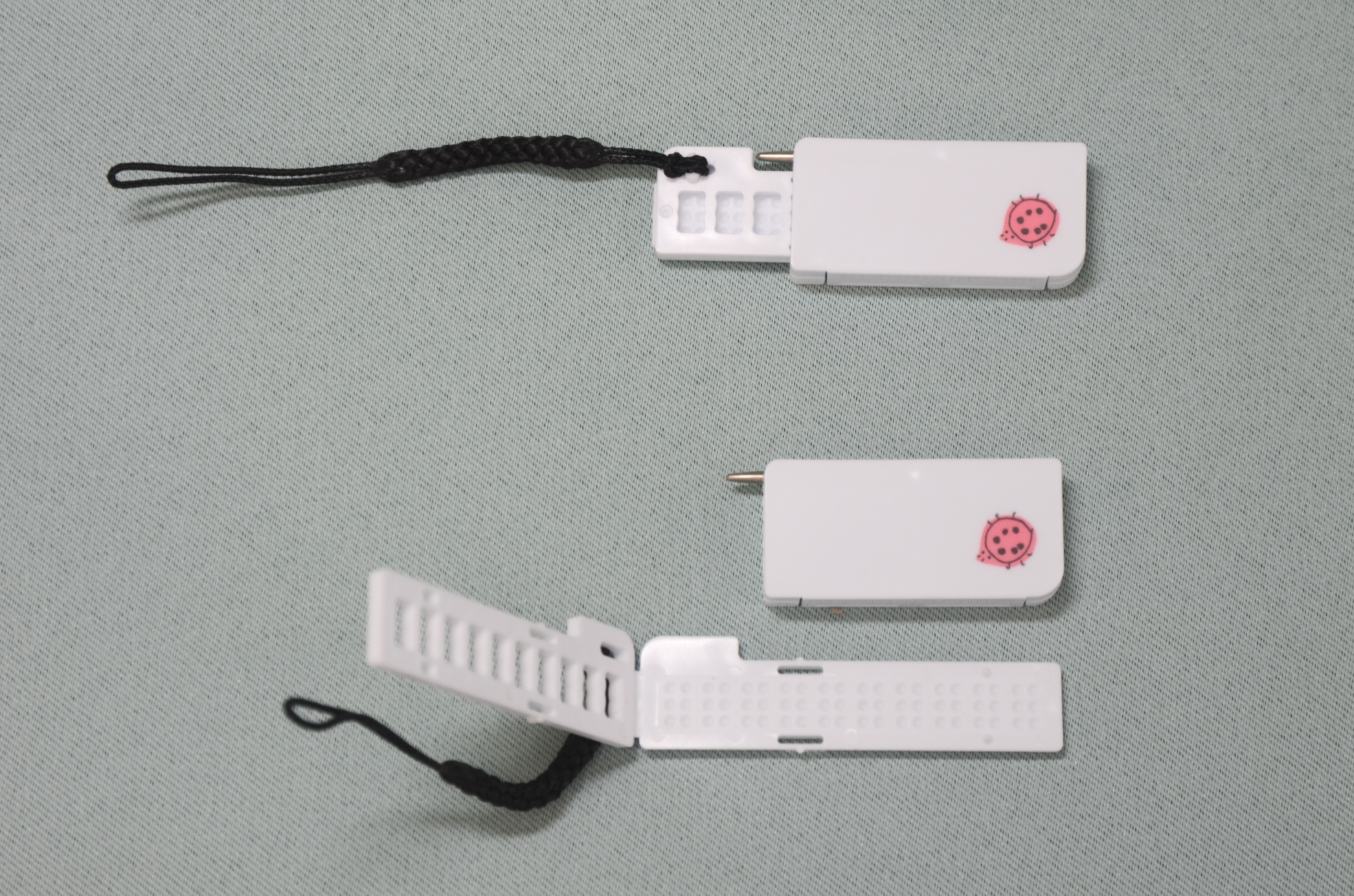 ストラップの付いた1行10マスの小さな点字器が刀の鞘のようなケースに入っています。2009年のルイ・ブライユ生誕200年を記念して発売された日点製の商品。色は白色。サイズは、縦1.9×横5.8×厚さ0.8cm。重さは5.5g。