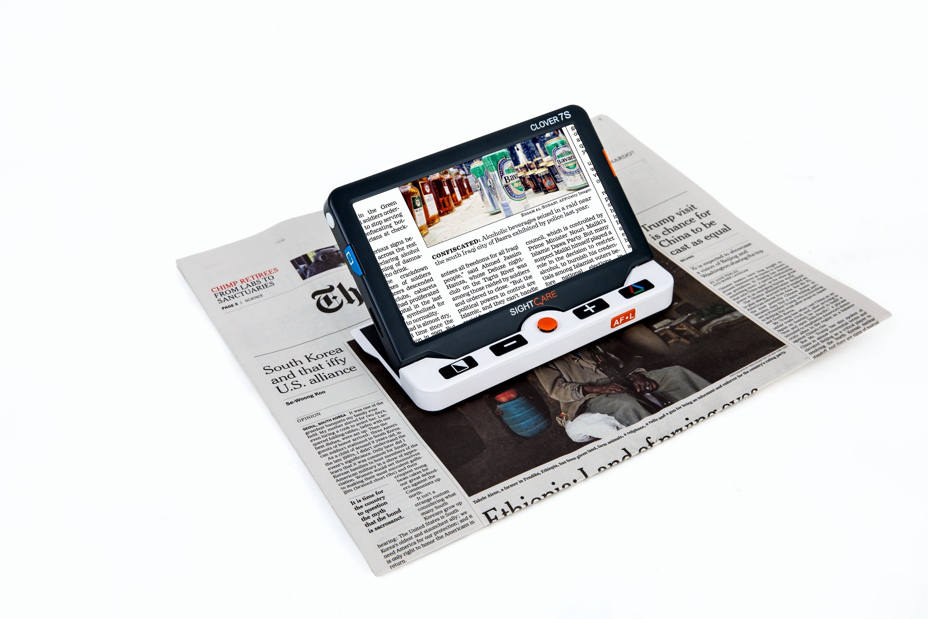 7インチのLCDモニタに、フルHDカメラを搭載。残像の少ないハイコントラスト画像など、タブレットPCにはない見えにくい方のための設計となっています。筆記や作業に便利なスタンドも標準の付属品に含まれています。拡大率は2.4~30倍の無段階調節。折りたたみ時のサイズは、幅18.8×高さ13.8×厚さ2.1cm。重さは416g。