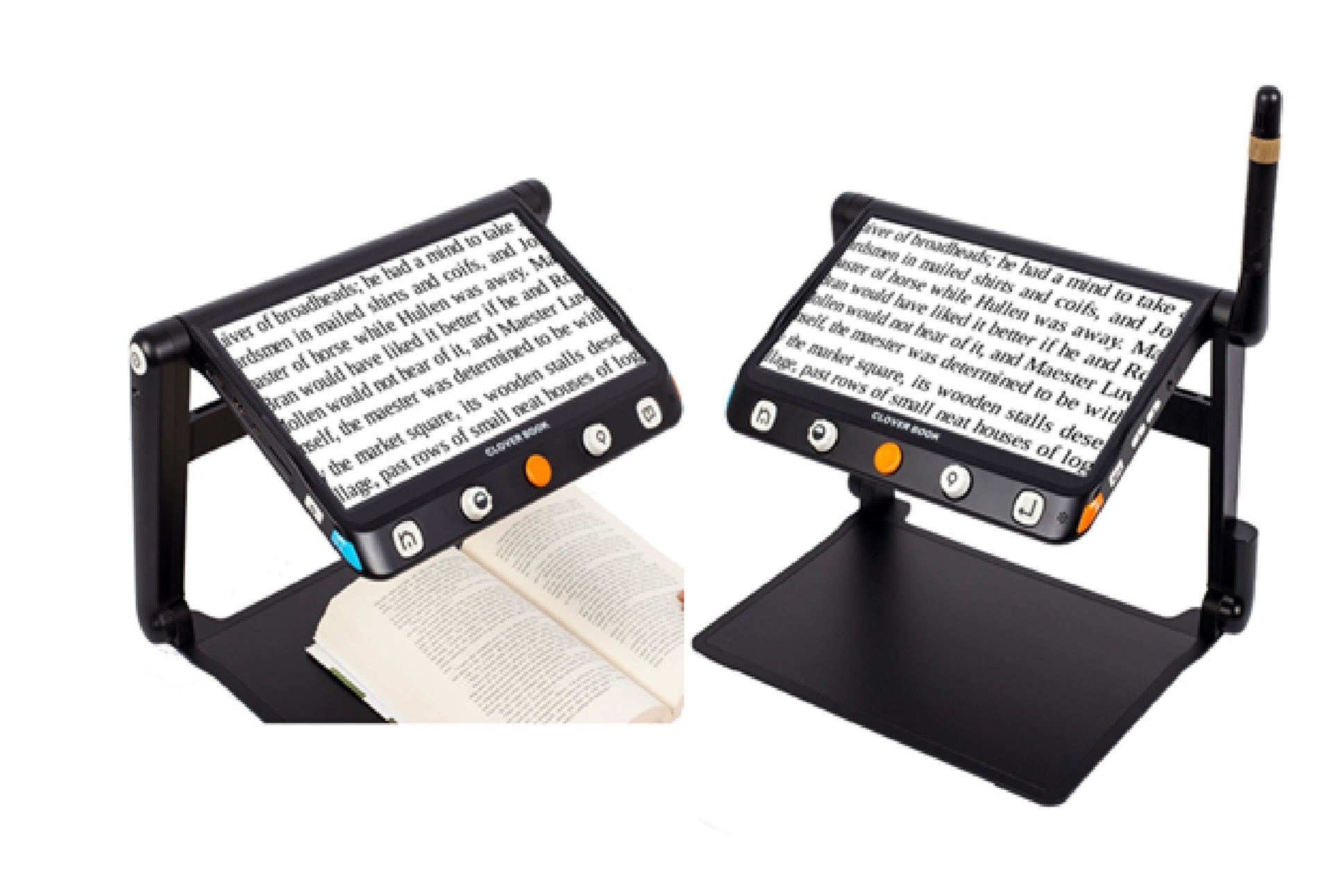 読み書きしやすい据置型と、持ち運び可能な携帯型の長所を生かした、12.5インチの折りたたんで持ち運べる拡大読書器。ボタン操作とタッチパネル操作の両方で使用可能です。クローバーブックは、遠方カメラで黒板など離れた場所の文字を拡大したり、自分の顔を確認することができるミラーモードが搭載されています。クローバーブック・メイトはテキストの音声読み上げ機能が搭載されており、映し出した文章を音声で聞くことができます。拡大率は読書モードで約1.5~約60倍。本体サイズは、縦26.2×横37.8×高さ26cm。重さは約2.4kg。